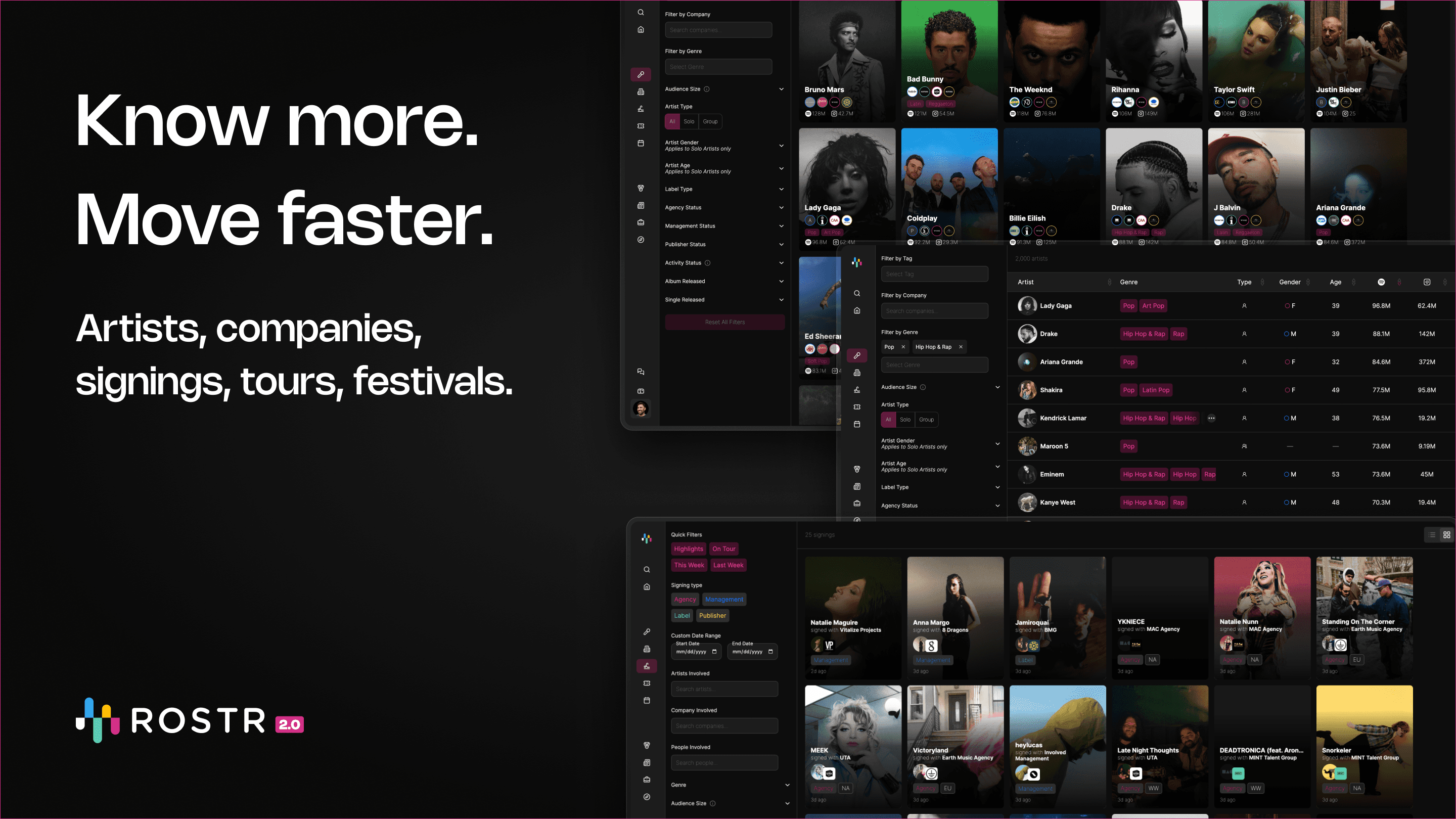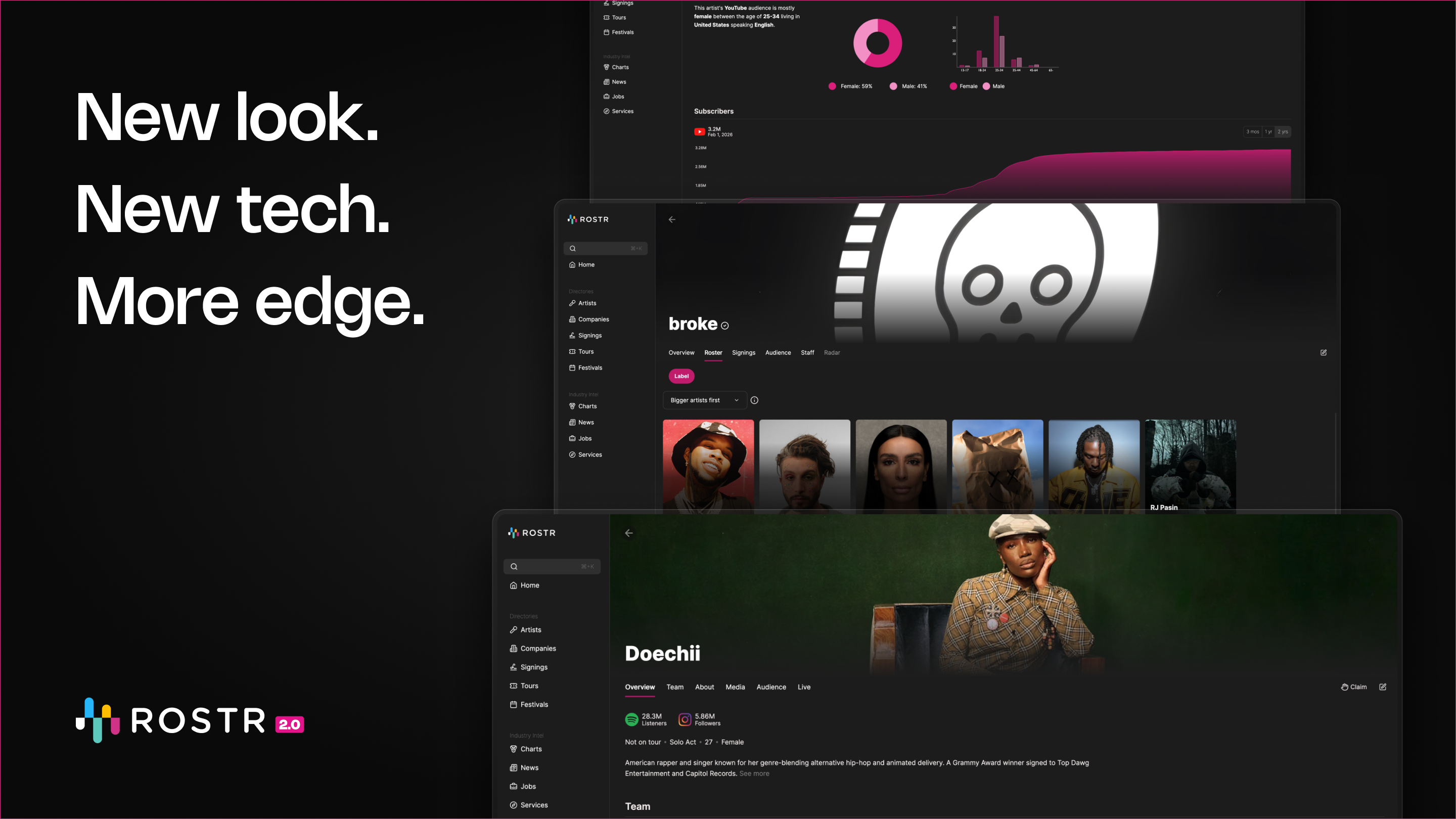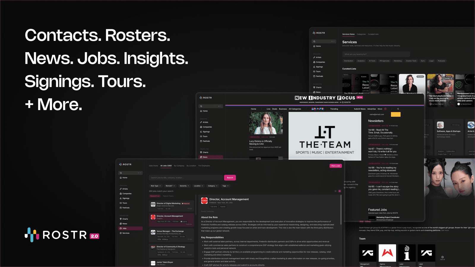 ROSTR 2.0 brings all of our products together for the first time: Contacts, Directories, Charts, Jobs, News, Services, and more. Now, alongside searching for artists or tracking signings, you can read the news, browse jobs, or find the latest industry services — all without leaving the platform.