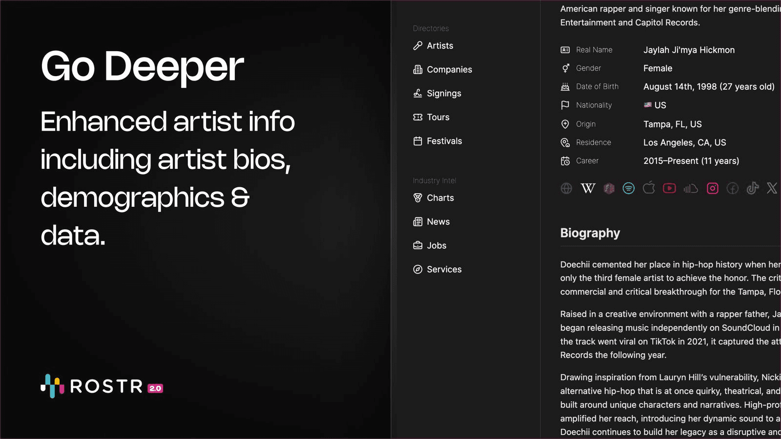 The about tab on artist profiles has gotten a major upgrade. For 15,000+ of the most popular artists on ROSTR, you'll now see much more detail, including in-depth bios written for industry professionals and a revamped Audience section (formerly Insights). Watch out for more data like this coming to the platform soon.