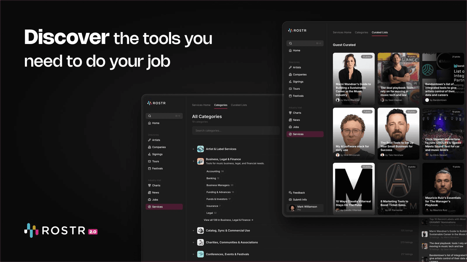 Our listings product Stack by ROSTR is now ROSTR Services – a Yelp-like collection of thousands of businesses, tools and services across the music industry ecosystem. Browse by category or check out our collection of curated lists.